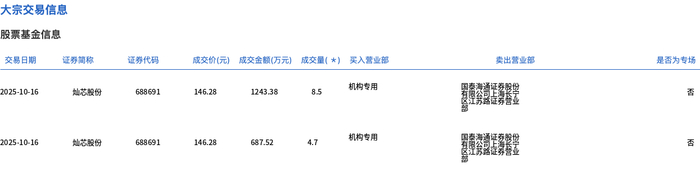 大宗交易概况 - 2025年10月16日,灿芯股份发生大宗交易,成交13.2万股,成交额1930.9万元,占当日总成交额的1.01% [1] - 成交价格为146.28元,较市场收盘价148.51元折价1.5% [1]   交易明细 - 当日共发生两笔大宗交易,买入营业部均为机构专用,成交价均为146.28元 [2] - 第一笔交易成交8.5万股,成交金额1243.38万元 [2] - 第二笔交易成交4.7万股,成交金额687.52万元 [2]