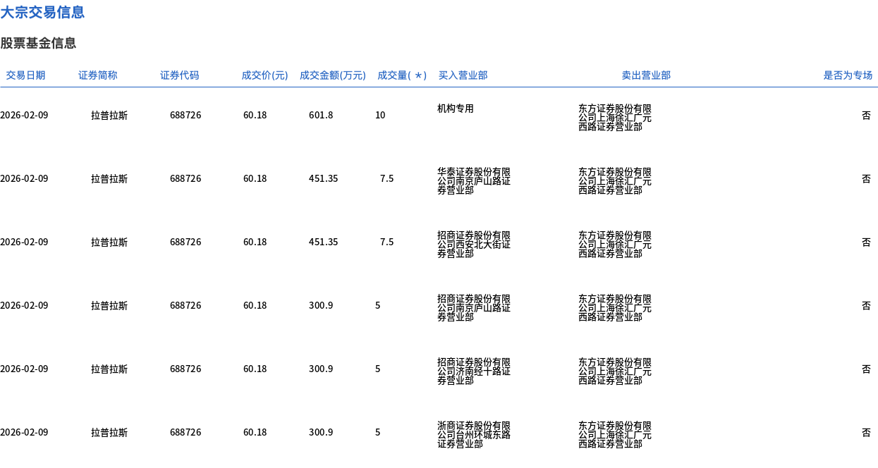 大宗交易概况 - 2026年2月10日,拉普拉斯发生大宗交易,总成交量47.84万股,总成交额3256.76万元,占当日总成交额的1.92% [1] - 该笔大宗交易成交均价为68.08元,较当日市场收盘价74.2元折价8.25% [1] - 交易价格区间在61元至73.09元之间 [1] 交易明细分析 - 当日共发生5笔大宗交易,其中4笔成交价为61元,1笔成交价为73.09元 [2][3] - 成交价为61元的4笔交易,合计成交金额为1210.24万元,合计成交量为19.84万股 [2] - 成交价为73.09元的1笔交易,成交金额为2046.52万元,成交量为28万股 [3] - 卖出营业部高度集中,主要为东方证券股份有限公司位于上海徐汇的相关营业部 [2] - 买入方包括机构专用席位、公司注册信誉中心、中信证券以及公司珠海葵口上路等不同性质的账户 [2][3]