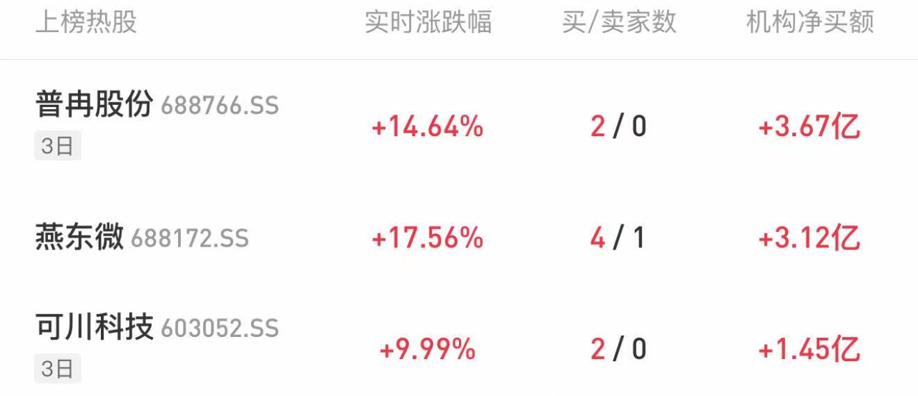 当天机构净卖出前三的股票分别是赤峰黄金、好想你、红宝丽,净流出金额分别是5.04亿元、1.07亿 元、9941万元。 | | 吃原橙 1.28 | | | --- | --- | --- | | 证券简称 | 日涨跌幅 | 机构净买入(万元) | | 普冉股份 | 14.64% | 36704.47 | | 燕矢微 | 17.56% | 31157.51 | | 可川科技 | 9.99% | 14493.78 | | 宏景科技 | 7.04% | 14451.23 | | 英方软件 | 17.77% | 13729.01 | | 中金黄金 | 10.01% | 13089.35 | | 巨力索具 | 9.99% | 10239.75 | | 章源钨业 | 7.82% | 9461.37 | | 通源石油 | 20.02% | 7657.21 | | 不留詞V | 10.02% | 6792.80 | | 北方股份 | 9.99% | 6212.95 | | 坤恒顺维 | 16.55% | 5502.50 | | 康强电子 | 10.02% | 3268.90 | | 拓日新能 | 4.39% | 2380.4 ...