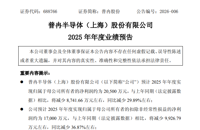 普冉股份(688766.SH)发预减,预计2025年归母净利润约2.05亿元,同比减少29.89%