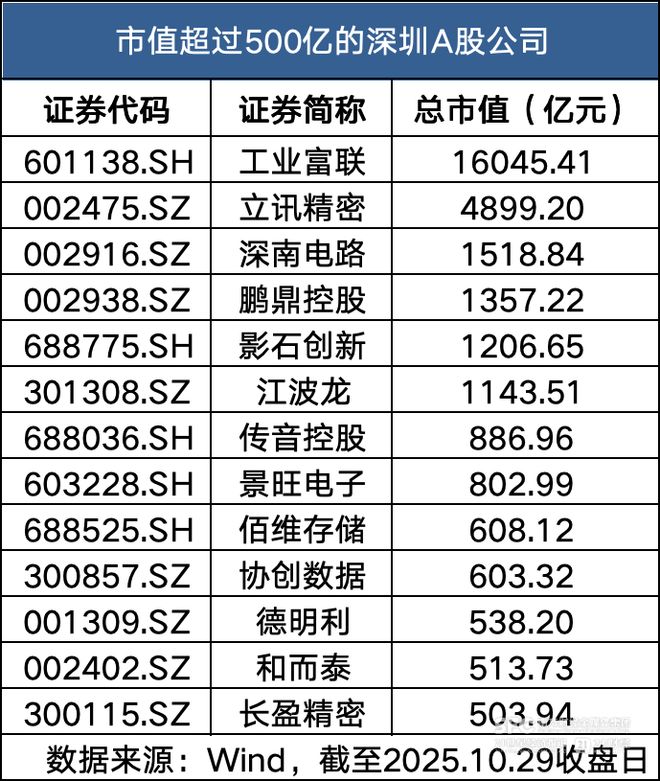 A股市场行业结构变化 - 2025年三季度电子行业总市值达13.6万亿元,占A股总市值12.8%,超越银行行业(总市值11.5万亿元,占比10.8%)成为A股第一大市值行业 [1] 深圳电子产业地位 - 深圳拥有115家A股电子行业上市公司,总量居全国首位,拥有1家万亿市值企业和5家千亿市值企业 [1][2] - 深圳电子产业从消费电子到半导体全面布局,正加速向全球电子信息产业价值链顶端迈进 [1][7] 深圳重点上市公司表现 - 工业富联总市值16045.41亿元,为苹果、英伟达核心供应商,前三季度营收6039.31亿元同比增长38.4%,净利润224.87亿元同比增长48.52% [2][3] - 立讯精密总市值4899.20亿元,切入英伟达GB200机架供应链并参与GB300机架认证 [2][4] - 深南电路、鹏鼎控股总市值分别为1518.84亿元和1357.22亿元,均向AI服务器领域转型 [2][4][5] - 江波龙总市值1143.51亿元,第三季度营收65.39亿元同比增长54.60% [2][5] - 影石创新总市值1206.65亿元,上市以来股价涨幅超70%,前三季度营收66.11亿元同比增长67.18% [2][5] 深圳半导体产业发展 - 2024年深圳半导体与集成电路产业规模达2564亿元同比增长26.8%,2025年上半年产业规模1424亿元同比增长16.9% [6] - 深圳市出台集成电路产业支持措施,设立首期规模50亿元的半导体与集成电路产业投资基金 [6] - 产业细分领域设计、制造、封测、设备规模较2020年均实现翻番 [6] 深圳电子产业链优势 - 消费电子领域拥有苹果、华为、荣耀、传音等主流手机厂商布局 [7] - 产业链涵盖海思半导体、华为鸿蒙、华星光电、比亚迪、富士康等关键企业,形成完整智能终端产业链 [7]