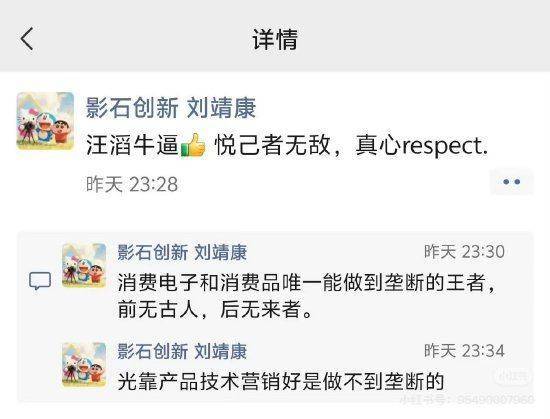 新浪讯 10月29日午间消息,近日,影石创新董事长刘靖康发布朋友圈,提到大疆创新董事长汪滔。 他表示真心敬佩汪滔,称汪滔是消费电子和消费品唯一能做到垄断的王者,前无古人,后无来者。刘靖 康还表示,"光靠产品技术营销好是做不到垄断的。" 【免责声明】本文仅代表作者本人观点,与和讯网无关。和讯网站对文中陈述、观点判断保持中立,不 对所包含内容的准确性、可靠性或完整性提供任何明示或暗示的保证。请读者仅作参考,并请自行承担 全部责任。邮箱:news_center@staff.hexun.com ...