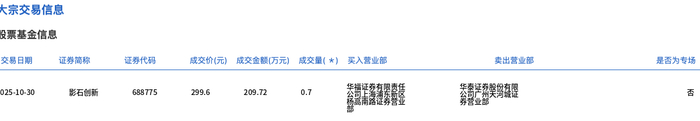 影石创新10月30日大宗交易平台出现一笔成交,成交量0.70万股,成交金额209.72万元,大宗交易成交 价为299.60元,相对今日收盘价折价2.51%。该笔交易的买方营业部为华福证券有限责任公司上海浦东 新区杨高南路证券营业部,卖方营业部为华泰证券股份有限公司广州天河城证券营业部。 证券时报·数据宝统计显示,影石创新今日收盘价为307.30元,上涨2.12%,日换手率为13.52%,成交额 为12.66亿元,全天主力资金净流入6962.64万元,近5日该股累计上涨11.34%,近5日资金合计净流入 1.52亿元。 据天眼查APP显示,影石创新科技股份有限公司成立于2015年07月09日,注册资本40100万人民币。 (数据宝) 10月30日影石创新大宗交易一览 | 成交量 | 成交金额 | 成交价 | 相对当日收盘 | | | | --- | --- | --- | --- | --- | --- | | (万 | (万元) | 格 | 折溢价(%) | 买方营业部 | 卖方营业部 | | 股) | | (元) | | | | | 0.70 | 209.72 | 299.60 | -2.51 | 华福证券 ...