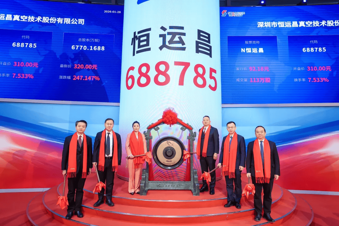 记者丨吴佳楠 编辑丨孙超逸 1月28日,广东深圳半导体设备核心零部件供应商——恒运昌真空技术股份有限公司("N恒运昌",688785.SH)在科创板成功上市。 这是2026年第一家科创板IPO上市企业,拿下深圳市2026年境内上市企业"开门红",也是深圳宝安区2026年首家上市企业。 图源:宝安日报 恒运昌发行价为92.18元/股,发行市盈率为48.39倍,开盘价为310元/股,盘中涨幅一度达到323%至390元/股,最终报收371.3元/股,涨幅达302.8%,收盘总 市值251亿元。 | | SSE CNY 15:30:20 闭市 查看L2全景 | | | | 疑似减持受限 科 融 △ ○ | | | --- | --- | --- | --- | --- | --- | --- | | 委比 | 77.80% 委差 | 169 | Wind ESG评级 - | | | 详 | | 菜中 | 371.50 | 4 | 交生 | 0.00% 120日 | | 0.00 | | 卖四 | 371.46 | 11 | 5日 | 0.00% 250日 | | 0.00 | | 卖三 | 371.44 | 3 | ...