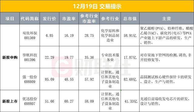 | | | | | 12月19日 交易提示 | | | | | --- | --- | --- | --- | --- | --- | --- | --- | | 项目 | 代码简称 发行价 | | 市盈率 | 参考行业 市盈率 | 参考行业 | 总市值 | 主营 聚乙烯醇(PVA)、特种纤维、醋酸 | | 新股申购 | 双欣环保 001369 答帆科技 | 6.85 | 16. 19 | 28. 75 | 化学原料和 化学制品制 造业 专业技术服 | 58.91亿 | 乙烯(VAC)、碳化钙(电石)等PVA 产业链上下游产品的研发、生产 、销售。 对存量地下管网的检测,调查,非 | | | | 22. 29 | 19.77 | 35. 36 | | 17.87亿 | | | | 001396 | | | | 务业 | | 开挖修复等。 | | | 弹一般份 608889 | 85.09 | 48. 55 | 57.92 | 计算机、通 信和其他电 子设备制造 | 82.68亿 | 品圆测试核心硬件探针卡的研发 、设计、生产与销售。 | | | | | | | AV | | | | 新股上市 | 优进股份 6 ...