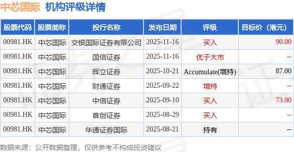 中芯国际港股市值4410.39亿港元,在半导体行业中排名第1。主要指标见下表: | 指标 | 中芯国际 | 未曾体 行业平均 | 行业排名 | | --- | --- | --- | --- | | ROE | 2.79% | 2.79% | 8 16 | | 港股流通市值 | 4410.39亿 | 373.08亿 | 1 16 | | 营业收入 | 88.35 Z | 41.88 乙 | 3 16 | | 净利率 | 10.55% | -63.15% | 2 16 | | 毛利率 | 21.45% | 26.14% | 8 16 | | 员债率 | 33.78% | 94.56% | 7 16 | 建银国际发布研报称,将中芯国际H股(00981.HK)目标价由62港元,调高至87港元,维持"跑赢大市"的 投资评级;而中芯国际A股的目标价90元人民币,调高40%至126元人民币,投资评级维持"中性"。 投行对该股的评级以买入为主,近90天内共有3家投行给出买入评级,近90天的目标均价为83.33港元。 交银国际证券有限公司最新一份研报给予中芯国际买入评级,目标价90港元。 机构评级详情见下表: | 股票代码 ...