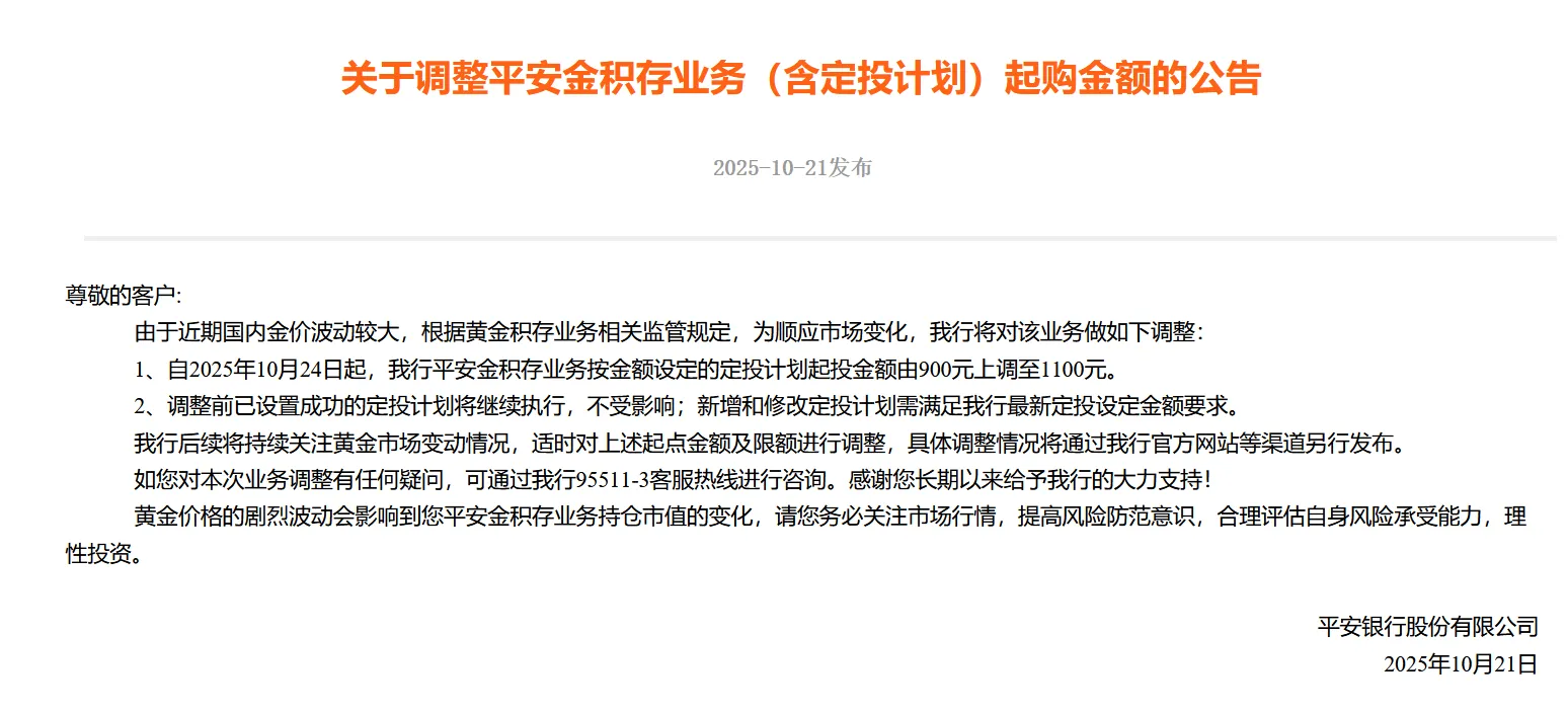北京商报讯(记者 宋亦桐)10月21日,平安银行发布公告表示,由于近期国内金价波动较大,根据黄 金积存业务相关监管规定,为顺应市场变化,该行将对该业务做出调整,自2025年10月24日起,平安银 行平安金积存业务按金额设定的定投计划起投金额由900元上调至1100元。 ...