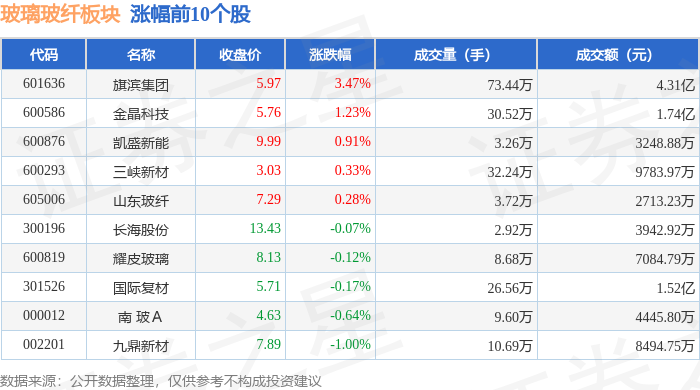 从资金流向上来看,当日玻璃玻纤板块主力资金净流出1.33亿元,游资资金净流出7388.14万元,散户资 金净流入2.07亿元。玻璃玻纤板块个股资金流向见下表: | 代码 | 名称 | 收盘价 | 涨跌幅 | 成交量(手) | 成交额(元) | | --- | --- | --- | --- | --- | --- | | 603256 | 宏和科技 | 29.02 | 3.09% | 12.85万 | 3.69亿 | | 301526 | 国际复材 | 5.54 | 2.21% | 28.74万 | 1.58亿 | | 605006 | 山东玻纤 | 7.24 | 1.69% | 4.38万 | 3163.75万 | | 600876 | 凯盛新能 | 10.21 | 1.49% | 6.02万 | 6085.14万 | | 300196 | 长海股份 | 13.33 | 1.37% | 3.24万 | 4311.41万 | | 600176 | 中国巨石 | 14.92 | 0.67% | 22.92万 | 3.43亿 | | 603601 | 再升科技 | 4.48 | 0.67% | 16.73万 | ...