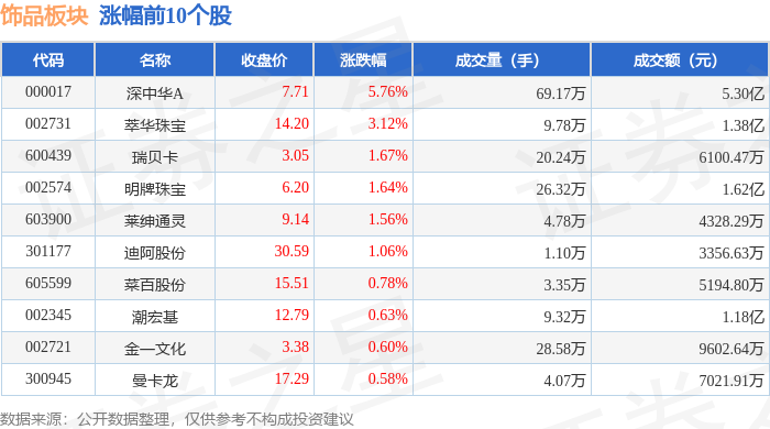 市场整体表现 - 2023年11月28日,饰品板块整体上涨0.81%,表现强于大盘,当日上证指数上涨0.34%,深证成指上涨0.85% [1] - 板块内个股普遍上涨,领涨股为深中华A,其股价上涨5.76%至7.71元,成交量为69.17万手,成交额为5.30亿元 [1] - 板块资金呈现分化,整体主力资金净流出1759.4万元,游资资金净流出1986.5万元,但散户资金净流入3745.9万元 [2] 个股价格与交易表现 - 深中华A涨幅居首,达5.76%,幸华珠宝上涨3.12%,瑞贝卡上涨1.67%,明牌珠宝上涨1.64%,莱绅通灵上涨1.56% [1] - 部分个股下跌,ST新华锦下跌0.80%,而老凤祥、周大生、中国黄金等个股涨幅较小,在0.16%至0.46%之间 [2] - 成交量方面,深中华A、金一文化、ST新华锦、明牌珠宝成交活跃,成交量均超过26万手 [1][2] 个股资金流向分析 - 深中华A获得主力资金净流入1726.66万元,主力净占比为3.26%,但游资和散户资金分别净流出215.84万元和1510.81万元 [3] - 瑞贝卡主力资金净流入658.72万元,占比高达10.80%,幸华珠宝主力资金净流入454.37万元,占比3.30% [3] - 多只个股遭遇主力资金净流出,其中菜百股份净流出301.59万元,周大生净流出262.93万元,曼卡龙净流出235.64万元 [3] - 游资资金在幸华珠宝、周大生、老凤祥有个别净流入,但在菜百股份、莱绅通灵、瑞贝卡等股票上净流出显著,其中菜百股份游资净流出594.30万元,占比-11.44% [3]