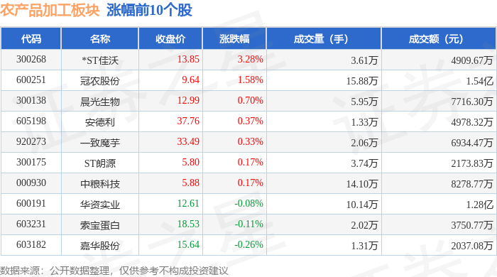 | 代码 | 名称 | 收盘价 | 涨跌幅 | 成交量(手) | 成交额(元) | | --- | --- | --- | --- | --- | --- | | 000505 | 京粮控股 | 7.75 | -2.88% | 46.98万 | 3.67亿 | | 600962 | 国投中鲁 | 20.71 | -2.03% | 7.55万 | 1.57亿 | | 002286 | 保龄宝 | 9.67 | -2.03% | 35.98万 | 3.52亿 | | 600737 | 中粮糖业 | 17.00 | -1.85% | 0 29.76万 | 5.09亿 | | 003030 | 祖名股份 | 19.69 | -1.80% | 2.76万 | 5468.28万 | | 001338 | 永顺泰 | 12.17 | -1.38% | 7.77万 | 9485.41万 | | 920023 | 田野股份 | 4.61 | -1.28% | 19.32万 | 8946.11万 | | 000911 | 广农糖业 | 7.39 | -0.94% | 6.12万 | 4520.53万 | | 002852 | 道 ...