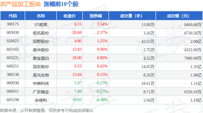 市场整体表现 - 2024年1月13日,农产品加工板块整体下跌1.13%,表现弱于大盘,当日上证指数下跌0.64%,深证成指下跌1.37% [1] - 板块内个股表现分化,在统计的20只个股中,7只上涨,13只下跌 [1][2] 领涨与领跌个股 - **领涨个股**:ST朗源涨幅最大,上涨3.54%,收盘价6.15元,成交额8469.68万元 [1];祖名股份上涨2.17%,收盘价20.68元 [1];田野股份上涨1.25%,成交额达2.08亿元 [1] - **领跌个股**:京粮控股领跌板块,跌幅达4.24%,收盘价7.67元,成交额3.16亿元 [2];国投中鲁下跌3.20%,收盘价23.91元,成交额4.18亿元 [2];中粮糖业下跌2.42% [2] 板块资金流向 - 当日农产品加工板块整体呈现主力资金净流出,净流出金额为3.24亿元 [2] - 游资与散户资金呈净流入状态,其中游资净流入8955.06万元,散户净流入2.34亿元 [2] 个股资金流向详情 - **主力资金净流入居前个股**:索宝蛋白主力净流入940.19万元,净占比11.77% [3];安德利主力净流入492.32万元,净占比4.14% [3] - **主力资金净流出居前个股**:ST朗源主力净流出1308.29万元,净占比15.45% [3];保龄宝主力净流出279.02万元 [3] - **资金流向分化**:部分个股如嘉华股份,主力资金小幅净流入30.63万元,但游资净流出459.52万元,显示内部资金态度不一 [3]