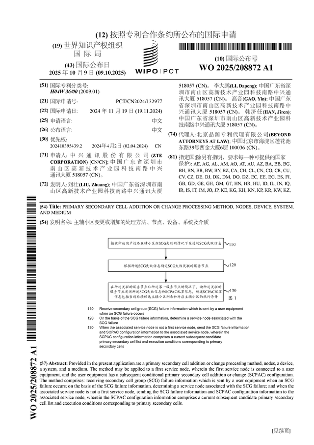 中兴通讯公布国际专利申请:“主辅小区变更或增加的处理方法、节点、设备、系统及介质”