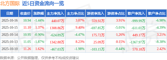 股票行情快报:北方国际(000065)10月16日主力资金净买入440.07万元