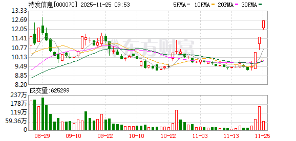 特发信息盘中涨停,已连收3个涨停板,截至9:39,该股报12.65元,换手率6.81%,成交量6053.15万 股,成交金额7.51亿元,涨停板封单金额为3.49亿元。连续涨停期间,该股累计上涨33.16%,累计换手 率为33.43%。最新A股总市值达113.89亿元,A股流通市值112.42亿元。 龙虎榜数据显示,该股因连续三个交易日内,涨幅偏离值累计达20%、日涨幅偏离值达7%上榜龙虎榜1 次,买卖居前营业部中,营业部席位合计净买入1.34亿元。 公司发布的三季报数据显示,前三季公司共实现营业收入31.84亿元,同比下降10.04%,实现净利润 799.61万元,同比增长80.75%,基本每股收益为0.0089元,加权平均净资产收益率0.53%。 据天眼查APP显示,深圳市特发信息股份有限公司成立于1999年07月29日,注册资本90034.476万人民 币。(数据宝) 近日该股表现 | 日期 | 当日涨跌幅(%) | 换手率(%) | 主力资金净流入(万元) | | --- | --- | --- | --- | | 2025.11.24 | 10.05 | 18.05 | 21452.74 | | 2 ...