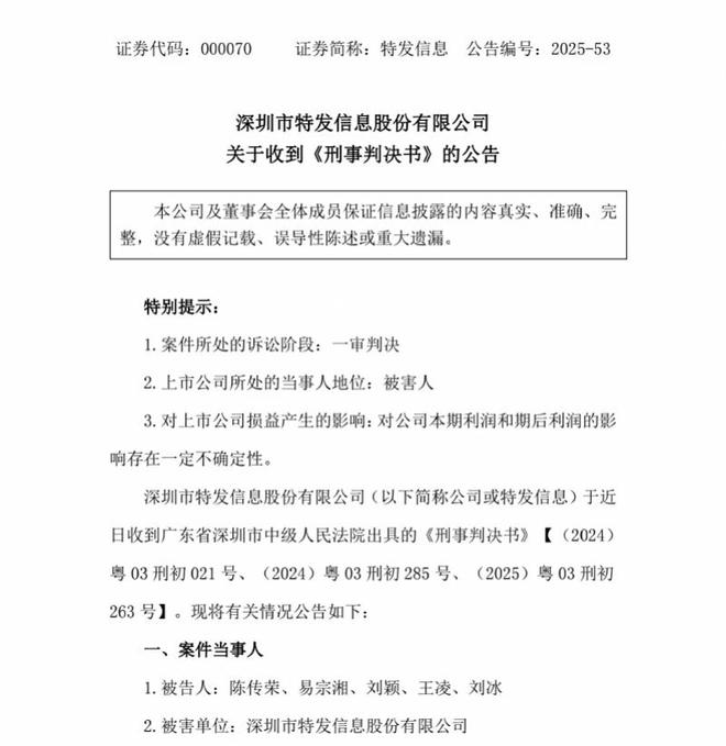 【导读】特发信息被合同诈骗、职务侵占一案,历时3年多迎来一审判决 中国基金报记者 闻言 12月11日晚间,特发信息发布公告称,广东省深圳市中级人民法院近日出具《刑事判决书》,针对公司收购深圳特发东智科技有限公司(以下简称特发东 智)被合同诈骗、职务侵占一案完成一审判决。 《刑事判决书》显示,陈传荣等4名原特发东智股东,通过财务造假的方式骗取特发信息财物,数额特别巨大,均构成合同诈骗罪。 截至12月11日收盘,特发信息股价报13.37元/股,跌幅达9.97%,总市值为120.4亿元。 具体来看,此案件被告人为陈传荣、易宗湘、刘颖、王凌、刘冰,被害单位是特发信息。 历时3年多迎来一审判决 2022年7月18日,特发信息收到深圳市公安局关于此案件的《立案告知书》。此案件后由深圳市公安局移送至广东省深圳市人民检察院起诉。如今,此案 件迎来一审判决。 《刑事判决书》显示,经依法审理,陈传荣、易宗湘、刘颖、王凌以非法占有为目的,在签订、履行协议过程中通过财务造假的方式骗取特发信息财物, 数额特别巨大,均构成合同诈骗罪。同时,陈传荣、刘冰利用职务便利,将单位财物非法占为己有,数额巨大,均构成职务侵占罪。 法院一审判决追缴陈 ...