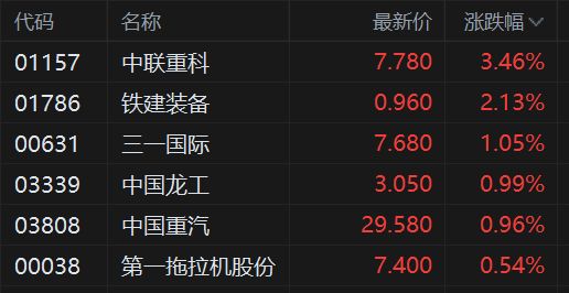 港股重型机械股继续涨势 中联重科续涨3.5%