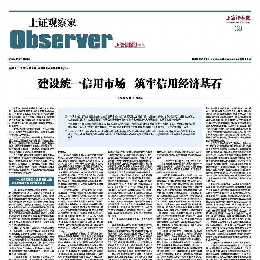 杨成长系全国政协委员、申万宏源研究首席经济学家;龚芳系申万宏源研究政策研究室主任、首席研究员; 方思元系申万宏源研究资深高级研 究员 | 聚焦"十五五"战略目标 | | | --- | --- | | 《中共中央关于制定国民经济和社会发展第十五个五年规划的建议》提出, | | | 要"构建统一、开放、竞争、有序的市场体系,建设法治经济、信用经济",这 | | | 标志着信用市场在市场经济体制机制改革及全国统一大市场建设中的重要性进 | | | 一步提升 | | | 加快健全信用体系和信用市场建设不仅是提升市场运行效率、优化营商环境的 | | | 现实需要,更是实现"十五五"规划战略目标的重要保障。近年来,受益于推进 | 全国统一大市场建设及数字经济的快速发展,我国已具备建设统一信用市场的 | | 良好基础 | | | "十五五"时期,应依托全国统一大市场建设,加快推进全国信用市场一体化进 | | | 程:一要从理念上重视全国统一信用市场的建设;二要加快构建高标准信用基 | | | 础设施体系;三要全面提升中介机构的信用评估定价能力;四要提升市场经营 | | | 主体的信用经营能力 | | | 近年来,我国高度 ...