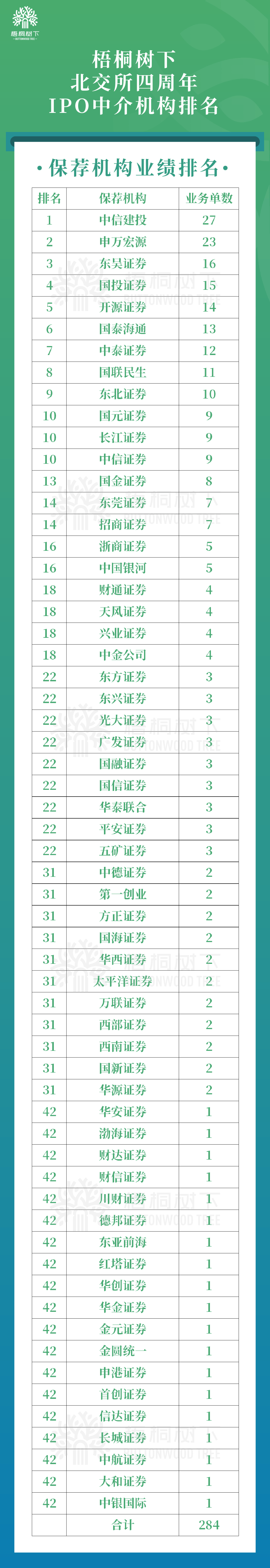 文/梧桐数据中心 11月15日,北交所迎来开市四周年!截至目前北交所共有282家上市公司,其中2021年79家,2022年83家,2023年77家,2024年23家,2025年至今20家。 已转板的观典防务、泰祥股份和翰博高新不纳入本次统计。这282家北交所上市公司的首发募资净额为510.50亿元。 一、保荐机构业绩排名 共有60家保荐机构为这282家北交所上市公司提供了IPO保荐业务。其中富士达、美心翼申分别聘请了两家保荐机构,各计一单,故业务单数总数为284 单。 榜单前三名: 第一名:中信建投(27单) 第二名:申万宏源(23单) 第三名:东吴证券(16单) | 排名 | 保荐机构 | 业务单数 | | --- | --- | --- | | 1 | 中信建投 | 27 | | 2 | 申万宏源 | 23 | | 3 | 东吴证券 | 16 | | 4 - | 国投证券 | 15 | | | 工温证完 | 1 4- | | 42 | 华安证券 | 1 | | --- | --- | --- | | 42 | 渤海证券 | 1 | | 42 | 财达证券 | 1 | | 42 | 财信证券 | 1 | | ...