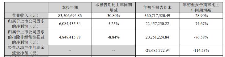 中国经济网北京11月20日讯 惠通科技(301601.SZ)近日发布2025年三季度报告。今年前三季度,公 司实现营业收入3.61亿元,同比下降28.90%;归属于上市公司股东的净利润2245.73万元,同比下降 74.67%;归属于上市公司股东的扣除非经常性损益的净利润2025.12万元,同比下降76.58%;经营活动 产生的现金流量净额为-2968.58万元,上年同期为2.04亿元。 | | 本报告期 | 本报告期比上年同期 增减 | 年初至报告期末 | 年初至报告期末比上 年同期增减 | | --- | --- | --- | --- | --- | | 营业收入(元) | 83,506,694.86 | 30.80% | 360.717.520.49 | -28.90% | | 归属于上市公司股东 | 6,084,435.34 | 5.25% | 22,457,250.22 | -74.67% | | 的净利润(元) | | | | | | 归属于上市公司股东 的扣除非经常性损益 | 4,848,415.78 | -8.84% | 20,251,224.84 | -76.58% | | 的净利润(元) ...