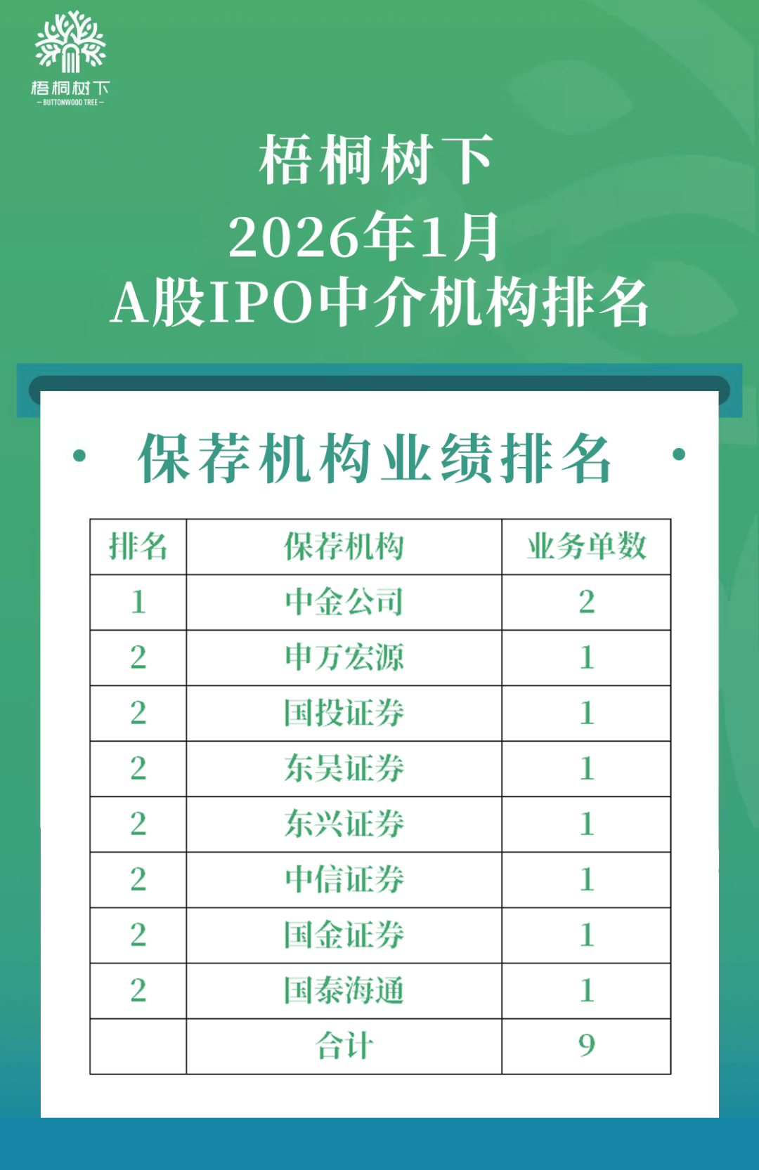 文/梧桐数据中心 2026年1月A股合计新上市公司9家,其中沪市主板3家、科创板1家、北交所5家,相较去年同期的12家,同比下降25%。这9家新上市公司募资净额为84.25 亿元,相较去年同期的62.97亿元,同比上升33.79%。 一、保荐机构业绩排名 中金公司排名第一,业务单数为2单; 申万宏源、国投证券、东吴证券、东兴证券、中信证券、国金证券、国泰海通7家券商各1单。 | 排名 | 保荐机构 | 业务单数 | | --- | --- | --- | | 1 | 中金公司 | 2 | | 2 | 申万宏源 | 1 | | 2 | 国投证券 | 1 | | 2 | 东吴证券 | 1 | | 2 | 东兴证券 | 1 | | 2 | 中信证券 | 1 | | C | 1 / 1 | 1 | | と | 国金加方 | | | --- | --- | --- | | 2 | 国泰海通 | | | | 合计 | 0 | 二、律师事务所业绩排名 2026年1月,共有8家保荐机构承担了这9家新上市公司的IPO上市业务。 2026年1月,共有6家会计师事务所为这9家新上市公司IPO提供了审计服务。 容诚业务单数为3单,排 ...