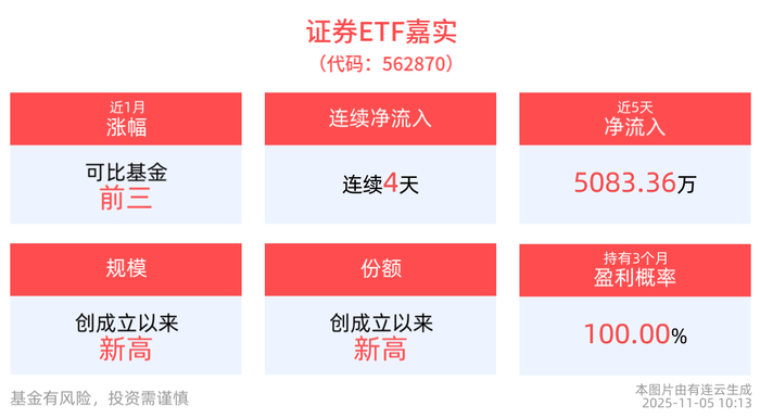 券商板块有望迎来价值重估,证券ETF嘉实(562870)连续4天净流入,规模、份额均创成立以来新高!