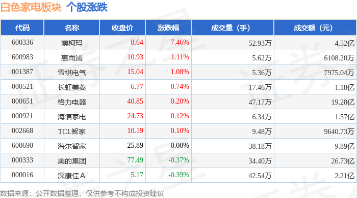 白色家电板块市场表现 - 2025年1月22日,白色家电板块整体微跌0.09%,表现弱于大盘,当日上证指数上涨0.14%,深证成指上涨0.5% [1] - 板块内个股表现分化,澳柯玛以7.46%的涨幅领涨,而深康佳A以0.39%的跌幅领跌 [1] - 板块整体成交活跃,主力资金净流入5.14亿元,但游资资金净流出5.55亿元,散户资金净流入4125.91万元 [1] 个股价格与成交情况 - 澳柯玛股价上涨7.46%至8.64元,成交52.93万手,成交额达4.52亿元 [1] - 格力电器股价微涨0.20%至40.85元,成交47.17万手,成交额高达19.28亿元 [1] - 美的集团股价下跌0.37%至77.49元,成交34.40万手,成交额为板块最高,达26.73亿元 [1] - 海尔智家股价持平于25.89元,成交38.18万手 [1] 个股资金流向分析 - 美的集团获得主力资金大幅净流入4.74亿元,净占比达17.73%,但同时遭遇游资净流出4.83亿元 [2] - 格力电器获得主力资金净流入7451.13万元,净占比3.86%,游资净流出1.01亿元 [2] - 海尔智家获得主力资金净流入4707.26万元,净占比4.76%,但散户资金净流出6052.93万元 [2] - 长虹美菱和深康佳A遭遇主力资金大幅净流出,分别达2751.84万元(净占比-23.35%)和3293.39万元(净占比-14.92%) [2]
