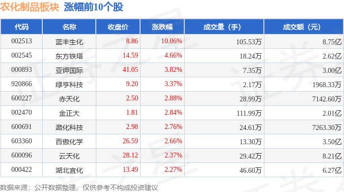 以上内容为证券之星据公开信息整理,由AI算法生成(网信算备310104345710301240019号),不构成投资建议。 从资金流向上来看,当日农化制品板块主力资金净流出1.21亿元,游资资金净流出1434.08万元,散户资 金净流入1.36亿元。农化制品板块个股资金流向见下表: 证券之星消息,10月21日农化制品板块较上一交易日上涨1.12%,蓝丰生化领涨。当日上证指数报收于 3916.33,上涨1.36%。深证成指报收于13077.32,上涨2.06%。农化制品板块个股涨跌见下表: | 代码 | 名称 | 收盘价 | 涨跌幅 | 成交量(手) | 成交额(元) | | | --- | --- | --- | --- | --- | --- | --- | | 002513 | 蓝丰生化 | 8.86 | 10.06% | 105.53万 | | 8.75亿 | | 002545 | 东方铁塔 | 14.59 | 4.66% | 18.24万 | | 2.62亿 | | 000893 | 亚锦国际 | 41.05 | 3.82% | 7.35万 | | 3.00亿 | | 920866 | 绿亨科技 | ...