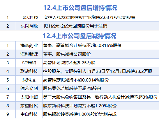 上市公司股份变动情况 - 12月4日盘后,共有2家A股上市公司披露增持情况,9家A股上市公司披露减持情况 [1] - 飞沃科技实控人张友君的控股企业增持公司股票2.63万股 [3] - 东阿阿胶计划以1亿元至2亿元的资金回购公司股份,并用于注销 [3] 上市公司减持详情 - 海森药业董事及高管计划合计减持不超过公司总股本的0.0816% [3] - 海科新源董事及股东减持了公司股份 [3] - ST瑞和高管计划减持不超过5.25万股公司股票 [3] - 联动科技控股股东及实际控制人在11月28日至12月3日期间减持了38.2万股 [3] - 深科技高管钟彦计划减持不超过公司总股本的0.0014% [3] - 德艺文创股东吴体芳计划减持不超过公司总股本的2% [3] - 太阳电缆第三大股东象屿集团及其一致行动人计划合计减持不超过公司总股本的3% [3] - 东望时代股东新岭科技计划减持不超过公司总股本的1.20% [3] - 中自科技股东银鞍岭英已完成减持公司1.00%股份的计划 [3]