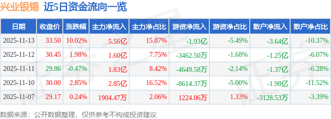 股价表现与资金流向 - 兴业银锡11月13日涨停收盘,收盘价为33.5元,当日涨幅为10.02% [1] - 该股于10点20分涨停,期间1次打开涨停,收盘时封单资金为7564.68万元,占其流通市值的0.13% [1] - 当日主力资金净流入5.56亿元,占总成交额的15.87%,游资资金净流出1.93亿元,散户资金净流出3.64亿元 [1] - 近5个交易日中,有4个交易日主力资金呈净流入状态,其中11月10日主力净流入2.85亿元,净占比高达16.52% [1] 公司业绩与经营状况 - 公司前三季度营业收入同比增长24.36% [1] - 公司经营活动现金流改善幅度达118.66% [1] 行业环境与市场催化 - 贵金属价格大幅上涨带动板块行情,现货黄金突破4200美元,白银价格涨幅超过4% [1] - 公司所属的有色 · 锡概念当日上涨7.81%,有色 · 钴概念上涨5.13%,白银概念上涨5.07% [1] - 有色金属行业政策面出现利好,再生金属产量预期突破2000万吨,缓解资源瓶颈的预期增强了市场信心 [1] 公司战略与资源储备 - 公司完成对宇邦矿业及澳大利亚Atlantic Tin的收购,使其银、锡资源储量跃居行业前列 [1] - 通过收购,公司的资源自给率得到提升 [1] 机构观点与市场情绪 - 西部证券等机构近期给予公司买入评级,强化了投资者对公司成长性的认可 [1]