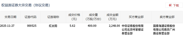 11月27日,红太阳大宗交易成交400万股,成交额2248万元,占当日总成交额的19.65%,成交价5.62 元,较市场收盘价5.73元折价1.92%。 | 交易日期 | 证券代码 | 证券简称 | 成交价格 | 成交量 | 成交金额 (万元) | 买方营业部 | 卖方营业部 | | --- | --- | --- | --- | --- | --- | --- | --- | | | | | (元) | (万股/万份) | | | | | 2025-11-27 | 000525 | 红太阳 | 5.62 | 400.00 | | 2,248.00 中信证券股份有限 | 国泰海通证券股份 | | | | | | | | 公司北京呼家楼证 | 有限公司南京广州 | | | | | | | | 劳营业部 | 路班券量不部 | ...