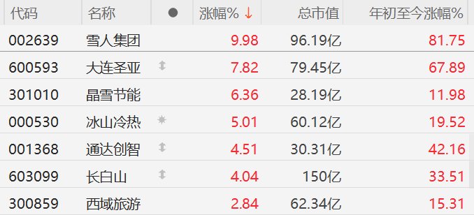 MACD金叉信号形成,这些股涨势不错! | 代码 | 名称 | . | 涨幅% ↓ | 总市值 | 年初至今涨幅% | | --- | --- | --- | --- | --- | --- | | 002639 | 雪人集团 | | 9.98 | 96.19亿 | 81.75 | | 600593 | 大连圣亚 | 1 | 7.82 | 79.45亿 | 67.89 | | 301010 | 龍雪节能 | | 6.36 | 28.19亿 | 11.98 | | 000530 | 冰山冷热 | 兼 | 5.01 | 60.12亿 | 19.52 | | 001368 | 通达创智 | 1 | 4.51 | 30.31亿 | 42.16 | | 603099 | 长日可 | 1 | 4.04 | 150亿 | 33.51 | | 300859 | 西域旅游 | | 2.84 | 62.34亿 | 15.31 | 格隆汇11月4日|A股市场冰雪经济概念股走强,其中,雪人集团涨停,大连圣亚涨近8%,晶雪节能涨 超6%,冰山冷热涨5%,通达创智、长白山涨超4%。 ...