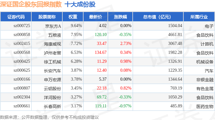 指数整体表现 - 深证国企股东回报指数10月22日报收1681.5点,单日微跌0.02% [1] - 指数成份股成交总额为290.62亿元,换手率达到1.04% [1] - 指数成份股中16家上涨,30家下跌,中钢国际以4.27%涨幅领涨,江铃汽车以5.74%跌幅领跌 [1] 前十大成份股详情 - 京东方A为指数第一大权重股,权重占比9.64%,最新股价4.02元,总市值1504.04亿元 [1] - 五粮液权重占比7.95%,股价120.10元,单日下跌0.35%,总市值4661.81亿元 [1] - 海康威视权重占比7.72%,股价33.47元,单日上涨2.73%,总市值3067.48亿元 [1] - 泸州老窖权重占比6.53%,股价134.67元,单日上涨0.34%,总市值1982.28亿元 [1] - 徐工机械权重占比6.28%,股价11.29元,单日上涨0.98%,总市值1326.91亿元 [1] - 长安汽车权重占比3.87%,股价12.40元,单日微涨0.08%,总市值1229.35亿元 [1] - 申万宏源权重占比3.78%,股价5.37元,当日平盘,总市值1344.64亿元 [1] - 云铝股份权重占比3.45%,股价22.18元,单日上涨0.82%,总市值769.19亿元 [1] - 洋河股份权重占比3.27%,股价69.72元,单日下跌0.33%,总市值1050.29亿元 [1] - 长春高新权重占比3.17%,股价119.11元,单日下跌0.97%,总市值485.89亿元 [1] 资金流向分析 - 指数成份股整体主力资金净流出4.51亿元,游资资金净流入5.12亿元,散户资金净流出6116.09万元 [3] - 海康威视获主力资金净流入3.74亿元,主力净占比11.31%,但游资净流出7842.68万元,散户净流出2.95亿元 [3] - 中材科技主力资金净流入1.41亿元,主力净占比5.87%,游资净流入4764.70万元 [3] - 云铝股份主力资金净流入1.37亿元,主力净占比9.46%,游资净流出1572.87万元,散户净流出1.21亿元 [3] - 江铃汽车主力资金净流入3037.51万元,游资净流入4428.81万元,游资净占比高达11.75%,但散户净流出7466.32万元,散户净占比-19.80% [3]
