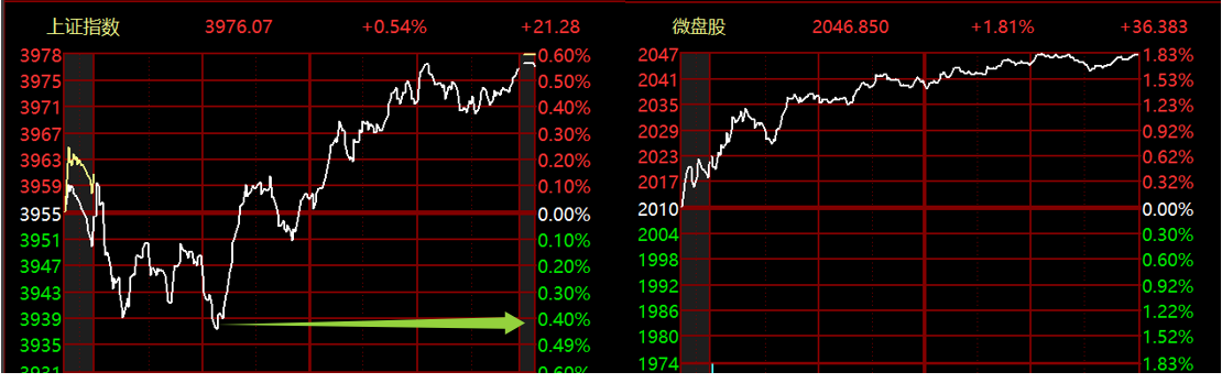 微盘股优先 11月日,市场探底回升,三大指数全线翻红。沪深两市成交额2.11万亿,较上一个交易日缩量2107亿。截至收盘,沪指涨0.55%,深成指涨0.19%,创业板指 涨0.29%。 | 上证指数 | | 3976.07 | +0.54% | | +21.28 | 微盘股 | 2046.850 | | +1.81% | +36.383 | | --- | --- | --- | --- | --- | --- | --- | --- | --- | --- | --- | | 3978 | | | | | =0.60% | 2047 | | Whit | | -1.83% | | 3975 | | | | | 0.50% | 2041 | | | | 1.53% | | 3971 | | | 111 | AN | 0.40% | 2035 | while | | | 1.23% | | 3967 | | | Thi | | 0.30% | 2029 | 5 | | | 0.92% | | 3963 W | | | | | 0.20% | 2023 | | | | 0.62% | | 3959 F | | | ...