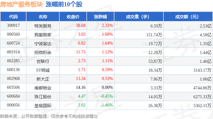 证券之星消息,1月28日房地产服务板块较上一交易日上涨1.03%,特发服务领涨。当日上证指数报收于 4151.24,上涨0.27%。深证成指报收于14342.9,上涨0.09%。房地产服务板块个股涨跌见下表: | 代码 | 名称 | 收盘价 | 涨跌幅 | 成交量(手) | 成交额(元) | | | --- | --- | --- | --- | --- | --- | --- | | 300917 | 特发服务 | 38.68 | 2.33% | 6.59万 | | 2.53亿 | | 000560 | 我爱我家 | 3.03 | 1.68% | 151.74万 | | 4.58亿 | | 600724 | 宁波富达 | 6.82 | 1.64% | 19.72万 | | 1.35亿 | | 001914 | 招商积余 | 11.73 | 1.12% | 12.28万 | | 1.44亿 | | 002285 | 世联行 | 2.73 | 1.11% | 53.87万 | | 1.46 Z | | 600136 | ST明诚 | 1.71 | 0.59% | 18.34万 | | 3143.17万 | | ...
