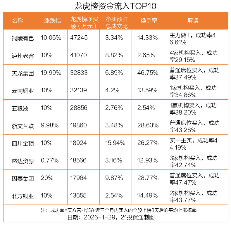 市场整体表现 - 2026年1月29日,上证指数上涨0.16%,深证成指下跌0.3%,创业板指下跌0.57% [1] - 当日共有55只个股因异动登上龙虎榜,其中26只被净买入,29只被净卖出 [1][3] 龙虎榜资金流向 - 龙虎榜资金净流入最多的个股是铜陵有色,净买入额为4.72亿元,占总成交金额的3.34%,该股当日收盘上涨10.06%,换手率为14.33% [1][3] - 龙虎榜资金净流出最多的个股是四川黄金,净卖出额为2.12亿元,占总成交金额的4.88%,该股当日收盘上涨9.98%,换手率为21.43% [3][4] 机构资金动向 - 当日有39只个股的龙虎榜出现机构身影,机构合计净卖出7.4亿元,其中净买入18股,净卖出21股 [4] - 机构净买入金额最多的个股是泸州老窖,净买入额为4.3978亿元,占总成交金额的9.44%,该股当日收盘上涨10%,换手率为2.65% [5][6] - 机构净卖出金额最多的个股是江西铜业,净卖出额为5.0508亿元,占总成交金额的4.48%,该股当日收盘上涨9.56%,换手率为8.15% [9] 北向资金动向 - 北向资金参与龙虎榜的个股共30只,合计净买入1.38亿元,其中沪股通净卖出5146.09万元,深股通净买入1.9亿元 [10] - 北向资金净买入金额最多的个股是铜陵有色,净买入2.41亿元,占总成交金额的1.7% [10] - 北向资金净卖出金额最多的个股是湖南白银,净卖出2.94亿元,占总成交金额的2.47%,该股当日收盘上涨9.02%,换手率为25.03% [10] 机构与北向资金协同与分歧 - 机构与北向资金共同净买入盛达资源、天龙集团等2只个股 [12] - 机构与北向资金共同净卖出凯迪股份、五粮液、洲际油气、潜能恒信、火炬电子、飞南资源、云南铜业等7只个股 [12] - 在铜陵有色上出现显著分歧,机构净卖出1.41亿元,而北向资金净买入2.41亿元 [12] - 在北方铜业上出现分歧,机构净卖出9979.3万元,北向资金净买入1.76亿元 [12] - 在江西铜业上出现分歧,机构净卖出5.05亿元,北向资金净买入1829.69万元 [12] - 在泸州老窖上出现分歧,机构净买入4.4亿元,北向资金净卖出2908.02万元 [12][13]