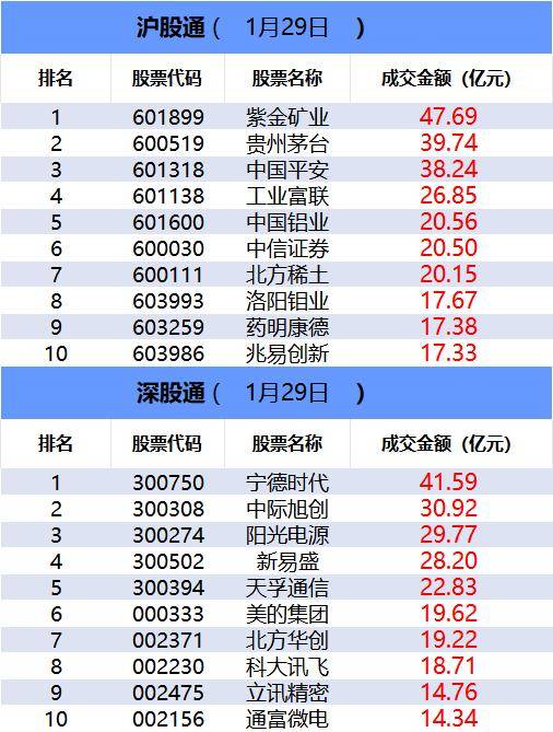 沪深股通成交概况 - 沪深股通今日合计成交3972.24亿元,其中沪股通成交1952.75亿元,深股通成交2019.49亿元 [1][2] - 沪股通前十大成交个股中,紫金矿业以47.69亿元位居首位,贵州茅台和中国平安分别以39.74亿元和38.24亿元位列第二、三位 [3] - 深股通前十大成交个股中,宁德时代以41.59亿元位居首位,中际旭创和阳光电源分别以30.92亿元和29.77亿元位列第二、三位 [3][4] 板块与个股主力资金流向 - 从板块表现看,白酒、油气、贵金属、房地产等板块涨幅居前,半导体等板块跌幅居前 [5] - 主力资金净流入方面,食品饮料行业以87.65亿元净流入居首,净流入率为10.12%,文化传媒、非银金融、房地产、银行板块也录得净流入 [6][7] - 主力资金净流出方面,电子板块净流出447.09亿元居首,净流出率为8.95%,计算机、有色金属、电新行业、机械设备板块净流出额也居前 [7] - 个股主力资金净流入方面,贵州茅台以32.48亿元净流入居首,净流入率为12.35%,蓝色光标、五粮液、北方稀土、科大讯飞等净流入额也进入前十 [8] - 个股主力资金净流出方面,工业富联以65.63亿元净流出居首,净流出率为34.49%,阳光电源、中国铝业、中芯国际、澜起科技等净流出额也进入前十 [9][10] ETF成交动态 - 从成交额前十的ETF来看,黄金ETF(518880)以177.99亿元成交额位居首位,环比增长48.80%,沪深300ETF华泰柏瑞(510300)以167.74亿元成交额位居次席 [12] - 从成交额环比增长前十的ETF来看,酒ETF(512690)成交额环比增长413.21%至43.27亿元,位居首位,食品饮料ETF(515170)成交额环比增长403.20%至6.46亿元,位居次席 [13] 龙虎榜机构与资金动向 - 机构买卖方面,白酒概念股泸州老窖涨停,获五家机构买入6.08亿元,同时遭两家机构卖出1.68亿元 [1][15] - 有色金属板块的铜陵有色走出5天4板,遭两家机构卖出1.41亿元,江西铜业遭一家机构卖出5.05亿元,另一白酒股五粮液遭三家机构卖出3亿元 [1][15][16] - 游资方面,有色金属板块持续强势,铜陵有色获一线游资方正证券重庆金开大道买入1.47亿元,同时获深股通买入2.41亿元,五粮液获一线游资国泰海通南京太平南路买入2.38亿元 [1][18] - 量化资金方面,铜陵有色获国信证券浙江互联网分公司买入0.85亿元,江西铜业遭量化资金激烈博弈,瑞银证券上海花园石桥路和高盛证券上海世纪大道分别买入3.08亿元和0.30亿元,国泰海通证券公司总部卖出0.88亿元 [1][19]