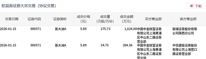 | 交易日期 | 证券代码 | 证券简称 | 成交价格 | 成交量 | 成交金额 | 买方营业部 | 卖方营业部 | | --- | --- | --- | --- | --- | --- | --- | --- | | | | | (元) | (万股/万份) | (万元) | | | | 2026-01-15 | 000571 | 新大洲A | 5.89 | 275.73 | | 1,624.08中国中金财富证券 | 联储证券股份有限 | | | | | | | | 有限公司上海黄浦 | 公司陕西分公司 | | | | | | | | 区中山东二路证券 | | | | | | | | | 营业部 | | | 2026-01-15 | 000571 | 新大洲A | 5.89 | 34.73 | 204.56 | 中国中金财富证券 | 中信建投证券股份 | | | | | | | | 有限公司上海黄浦 | 有限公司上海营口 | | | | | | | | 区中山东二路证券 | 路证券营业部 | | | | | | | | 25 - 11, 207 | | 1月15日,新大洲A大宗交易成交310.46万股,成交 ...