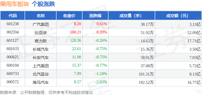 证券之星消息,12月25日乘用车板块较上一交易日下跌0.07%,海马汽车领跌。当日上证指数报收于 3959.62,上涨0.47%。深证成指报收于13531.41,上涨0.33%。乘用车板块个股涨跌见下表: | 代码 | 名称 | 收盘价 | 涨跌幅 | 成交量(手) | 成交额(元) | | --- | --- | --- | --- | --- | --- | | 601633 | 长城汽车 | 22.17 | 0.68% | 9.14万 | 2.01亿 | | 002594 | 比亚迪 | 94.84 | 0.44% | 18.22万 | 17.26 乙 | | 600104 | 上汽集团 | 15.44 | 0.00% | 26.09万 | 4.03亿 | | 000625 | 长安汽车 | 11.90 | -0.25% | 50.63万 | 6.02亿 | | 601127 | 赛力斯 | 119.11 | -0.49% | 10.93万 | 13.02亿 | | 601238 | 广汽集团 | 8.12 | -1.10% | 36.04万 | 2.94亿 | | 600733 | 北汽蓝谷 | 8. ...
