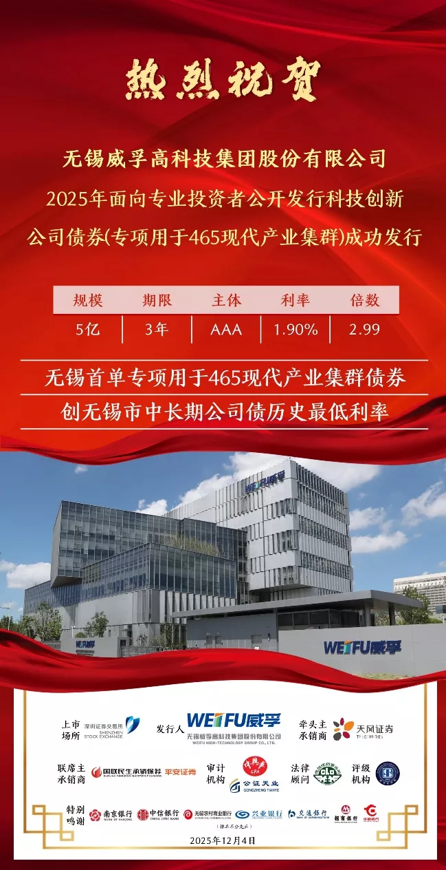 债券发行核心信息 - 公司于12月4日在深圳证券交易所成功簿记发行债券“25威孚K1”,总规模5亿元,期限3年,票面利率1.90%,创无锡市中长期公司债历史最低利率 [1] - 本期债券是公司首次亮相债券市场,由天风证券担任牵头主承销商,国联民生证券、平安证券担任联席主承销商 [1] - 债券全场认购倍数达2.99倍,体现了资本市场对公司信用资质、经营实力与发展前景的高度认可 [1] 债券募集资金用途与战略意义 - 本期债券是无锡首单专项用于“465”现代产业集群的债券,募集资金主要以股权投资形式精准支持汽车零部件领域科技创新 [4] - 债券资金将直达汽车核心零部件产业集群,旨在为产业链上的创新主体注入关键资本,促进技术协同与产业链整体升级 [4] - 此举标志着公司创新运用金融工具,担当起驱动地方产业转型升级、培育新质生产力的关键角色 [4] 公司战略定位与行业背景 - 本期债券是金融服务国家战略、推动产业升级的典范实践,中央经济工作会议明确将“以科技创新引领现代化产业体系建设”列为重点任务 [4] - 无锡市前瞻性布局的“465”现代产业体系是对国家战略的精准落地,本期债券为无锡打造具有全国影响力的产业科技创新高地提供支撑 [4] - 公司将持续聚焦“465”现代产业集群的发展需求,充分发挥自身在汽车核心零部件领域的产业资源和资本平台优势,为构建更具韧性和竞争力的现代产业体系持续赋能 [4]