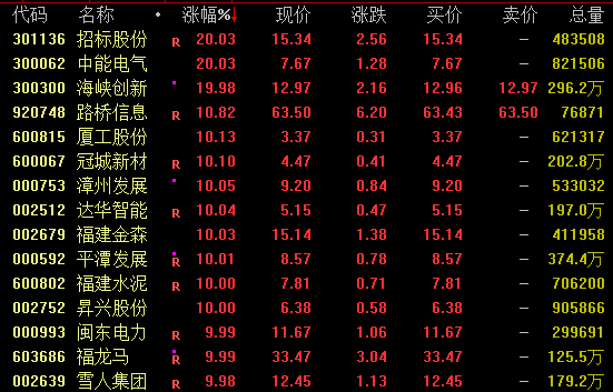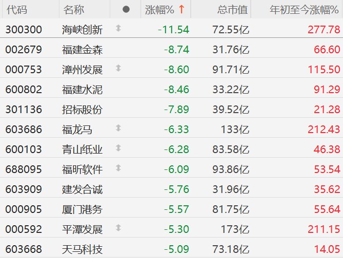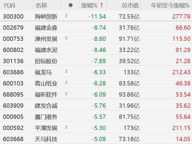 | 代码 | 名称 | | 涨幅% ↑ | 总市值 | 年初至今涨幅% | | --- | --- | --- | --- | --- | --- | | 300300 | 海峡创新 | 1 | -11.54 | 72.55亿 | 277.78 | | 002679 | 福建金森 | | -8.74 | 31.76亿 | 66.60 | | 000753 | 漳州发展 | → | -8.60 | 91.71亿 | 115.50 | | 600802 | 福建水泥 | | -8.46 | 33.22亿 | 91.29 | | 301136 | 招标股份 | | -7.89 | 39.52亿 | 21.28 | | 603686 | 福龙马 | 1 | -6.33 | 133亿 | 212.43 | | 600103 | 量山紙业 | - | -6.28 | 83.58亿 | 46.38 | | 688095 | 福昕软件 | 4 | -6.09 | 93.86亿 | 53.54 | | 603909 | 建发合诚 | | -5.76 | 31.96亿 | 35.62 | | 000905 | 厦门港务 | | ...
