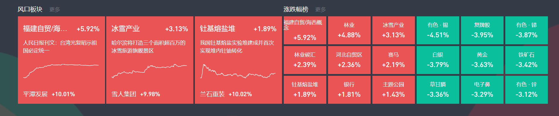 ↑点击上面图片 加雪球核心交流群 ↑ A股三大指数今日集体回调,截止收盘,沪指跌0.41%,收报3960.19点;深证成指跌1.71%,收报13175.22点;创业板指跌1.96%,收报3134.09点。 沪深两市成交额仅有19158亿,较昨日缩量1914亿。 行业板块涨少跌多,银行、旅游酒店、铁路公路板块涨幅居前,贵金属、能源金属、电池、电机、风电设备、医疗服务板块跌幅居前。 个股方面,上涨股票数量超过1600只,近70只股票涨停。福建板块逆势上扬,平潭发展13天10板,福建金森等十余股涨停。核电板块反复活跃,其 中钍基熔盐堆概念表现较强,兰石重装4天3板。煤炭板块再度走强,安泰集团14天8板。"马字辈"股逆势活跃,天马科技等多股涨停。下跌方面, 创新药概念震荡调整,常山药业跌停。贵金属概念股集体下挫,国城矿业跌停。 01 福建本地股爆发! 今日两岸概念、福建股逆势狂掀涨停潮。截至收盘,招标股份、中能电气、海峡创新20CM涨停,厦工股份、漳州发展、达华智能、福建水泥、闽 东电力、厦门港务等近20支个股涨停。 | 福建 | | | | | --- | --- | --- | --- | | 7539.88 ( ...