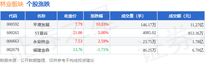 证券之星消息,11月3日林业板块较上一交易日上涨6.87%,平潭发展领涨。当日上证指数报收于 3976.52,上涨0.55%。深证成指报收于13404.06,上涨0.19%。林业板块个股涨跌见下表: | 代码 | 名称 | 收盘价 | 涨跌幅 | 成交量(手) | 成交额(元) | | | --- | --- | --- | --- | --- | --- | --- | | 000592 | 平潭发展 | 7.79 | 10.03% | 146.17万 | | 11.27 Z | | 600265 | ST景谷 | 21.00 | 5.00% | 4085.02 | 853.36万 | | | 000663 | 永安林业 | 7.53 | 2.59% | 23.75万 | | 1.78亿 | | 002679 | 福建金森 | 13.76 | -1.71% | 46.25万 | | 6.70亿 | | 代码 | 名称 |主力净流入(元) | | | | 主力净占比 游资净流入(元) 游资净占比 散户净流入(元) 散户净占比 | | | | --- | --- | --- | --- | --- | --- ...