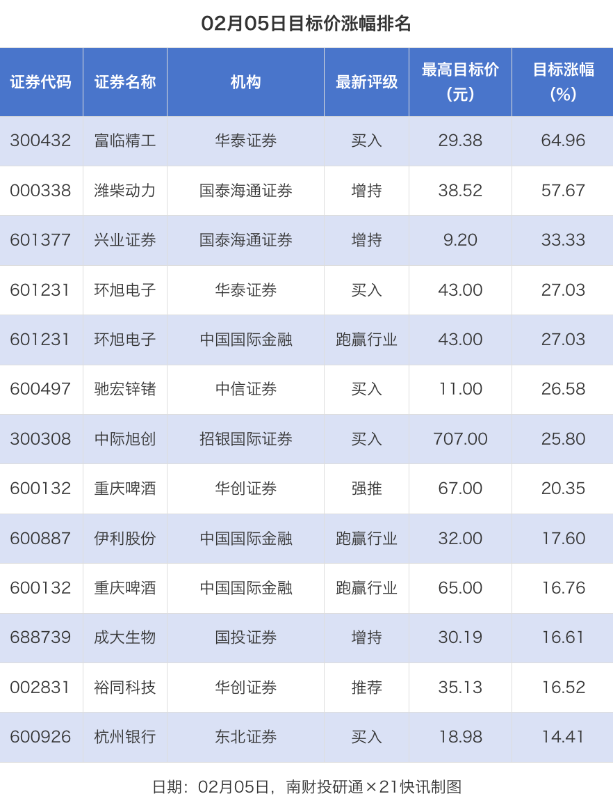 券商评级与目标价概览 - 2月5日,券商共发布13次上市公司目标价,按最新收盘价计算,目标价涨幅排名前三的公司分别为富临精工(64.96%)、潍柴动力(57.67%)和兴业证券(33.33%)[1] - 富临精工所属电池行业,华泰证券给予“买入”评级,最高目标价29.38元[3] - 潍柴动力所属汽车零部件行业,国泰海通证券给予“增持”评级,最高目标价38.52元[3] - 兴业证券所属证券行业,国泰海通证券给予“增持”评级,最高目标价9.20元[3] 具体公司评级与目标价详情 - 环旭电子获得华泰证券“买入”和中国国际金融“跑赢行业”评级,最高目标价均为43.00元,对应目标涨幅27.03%[3] - 驰宏锌锗获得中信证券“买入”评级,最高目标价11.00元,目标涨幅26.58%[3] - 中际旭创获得招银国际证券“买入”评级,最高目标价707.00元,目标涨幅25.80%[3] - 重庆啤酒获得华创证券“强推”评级,最高目标价67.00元,目标涨幅20.35%;同时获得中国国际金融“跑赢行业”评级,最高目标价65.00元,目标涨幅16.76%[3] - 伊利股份获得中国国际金融“跑赢行业”评级,最高目标价32.00元,目标涨幅17.60%[3] - 成大生物获得国投证券“增持”评级,最高目标价30.19元,目标涨幅16.61%[3] - 裕同科技获得华创证券“推荐”评级,最高目标价35.13元,目标涨幅16.52%[3] - 杭州银行获得东北证券“买入”评级,最高目标价18.98元,目标涨幅14.41%[3] 券商推荐关注度排名 - 2月5日共有21家上市公司获得券商推荐,其中重庆啤酒获得3家券商推荐,环旭电子获得2家券商推荐,大唐发电获得1家券商推荐[3] - 重庆啤酒收盘价55.67元,所属非白酒行业,是当日获得推荐券商数量最多的公司[4] - 环旭电子收盘价33.85元,所属消费电子行业,是当日获得推荐券商数量第二多的公司[4] 券商首次覆盖公司 - 2月5日券商共给出4次首次覆盖,涉及南山铝业、建投能源、杭州银行和协创数据四家公司[4] - 南山铝业获得国盛证券首次覆盖并给予“买入”评级,所属工业金属行业[5] - 建投能源获得长江证券首次覆盖并给予“买入”评级,所属电力行业[5] - 杭州银行获得东北证券首次覆盖并给予“买入”评级,所属城商行行业[5] - 协创数据获得华鑫证券首次覆盖并给予“买入”评级,所属消费电子行业[5]