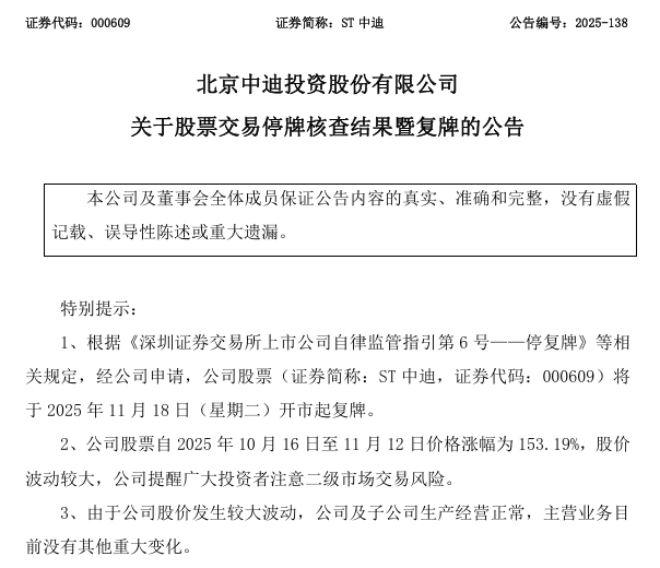ST中迪(000609.SZ)完成停牌核查 11月18日起复牌