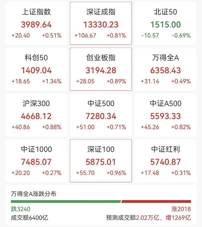 【导读】存储芯片概念股走高,磷化工板块异动拉升 中国基金报记者 李智 一起来看下最新的市场情况及资讯。 11月6日开盘,A股市场震荡走高,创业板指一度涨逾1%。截至发稿,沪指涨0.51%,深成指涨0.81%, 创业板指涨0.89%。 | 上证指数 | 深证成指 | 北证50 | | --- | --- | --- | | 3989.64 | 13330.23 | 1515.00 | | +20.40 +0.51% | +106.67 +0.81% | -10.57 -0.69% | | 科创50 | 创业板指 | 万得全A | | 1409.04 | 3194.28 | 6358.43 | | +18.65 +1.34% | +28.05 +0.89% | +31.14 +0.49% | | 沪深300 | 中证500 | 中证A500 | | 4668.12 | 7280.34 | 5593.33 | | +40.86 +0.88% +51.00 +0.71% +45.26 +0.82% | | | | 中证1000 | 深证100 | 中证红利 | | 7485.07 | 5875.01 | 5740.8 ...