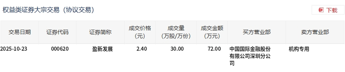 交易概况 - 盈新发展于2025年10月23日发生一笔大宗交易,成交量为30万股,成交额为72万元 [1] - 该笔大宗交易的成交价格为每股2.40元,与当日市场收盘价持平 [1] - 此笔交易占公司当日总成交额的1% [1] 交易细节 - 交易类型为权益类证券大宗交易(协议交易)[2] - 买方营业部为中国国际金融股份有限公司深圳分公司 [2] - 卖方营业部为机构专用席位 [2]