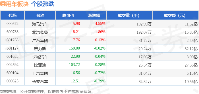 板块整体表现 - 10月28日乘用车板块整体下跌0.18%,表现弱于上证指数(下跌0.22%)但略强于深证成指(下跌0.44%)[1] - 板块内个股表现分化,长安汽车领跌,跌幅为0.79%[1] - 板块整体成交活跃,主力资金净流出3.57亿元,但游资和散户资金分别净流入9567.72万元和2.61亿元[1] 个股价格变动 - 海马汽车(代码000572)涨幅最大,达4.55%,收盘价为5.98元,成交量为192.99万手,成交额为11.52亿元[1] - 北汽蓝谷(代码600733)上涨1.86%,收盘价为8.21元,成交量为192.07万手[1] - 广汽集团(代码601238)微涨0.13%,收盘价为7.76元[1] - 赛力斯(代码601127)和长城汽车(代码601633)跌幅较小,分别为-0.02%和-0.04%[1] - 比亚迪(代码002594)下跌0.28%,收盘价为103.72元[1] - 上汽集团(代码600104)下跌0.72%,收盘价为16.56元[1] - 长安汽车(代码000625)下跌0.79%,收盘价为12.51元,成交量为84.32万手,成交额为10.56亿元[1] 个股资金流向 - 北汽蓝谷获得主力资金净流入1.85亿元,主力净占比达11.70%,但游资和散户资金分别净流出1.12亿元和7333.47万元[2] - 海马汽车和广汽集团分别获得主力资金净流入2733.39万元和2178.21万元,主力净占比分别为2.37%和8.88%[2] - 长安汽车、赛力斯和比亚迪遭遇主力资金大幅净流出,金额分别为1.06亿元、2.20亿元和2.34亿元,主力净占比分别为-10.06%、-6.86%和-8.51%[2] - 上汽集团主力资金净流出3374.37万元,但游资净流入3083.38万元[2] - 长城汽车主力资金小幅净流入342.83万元,游资净流入2538.15万元,但散户资金净流出2880.99万元[2]