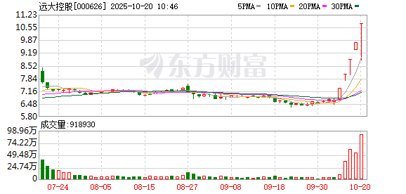 股价表现 - 远大控股于10月20日盘中剧烈震荡,上演“天地天板”行情 [1] - 该股当日以涨停开盘,随后快速跳水触及跌停,之后再度震荡涨停 [2] - 公司股价走出连续5个交易日涨停的态势 [1] 交易数据 - 截至发稿,公司股价报10.74元 [3] - 当日成交额超过9亿元 [3] - 当日换手率超过18% [3]