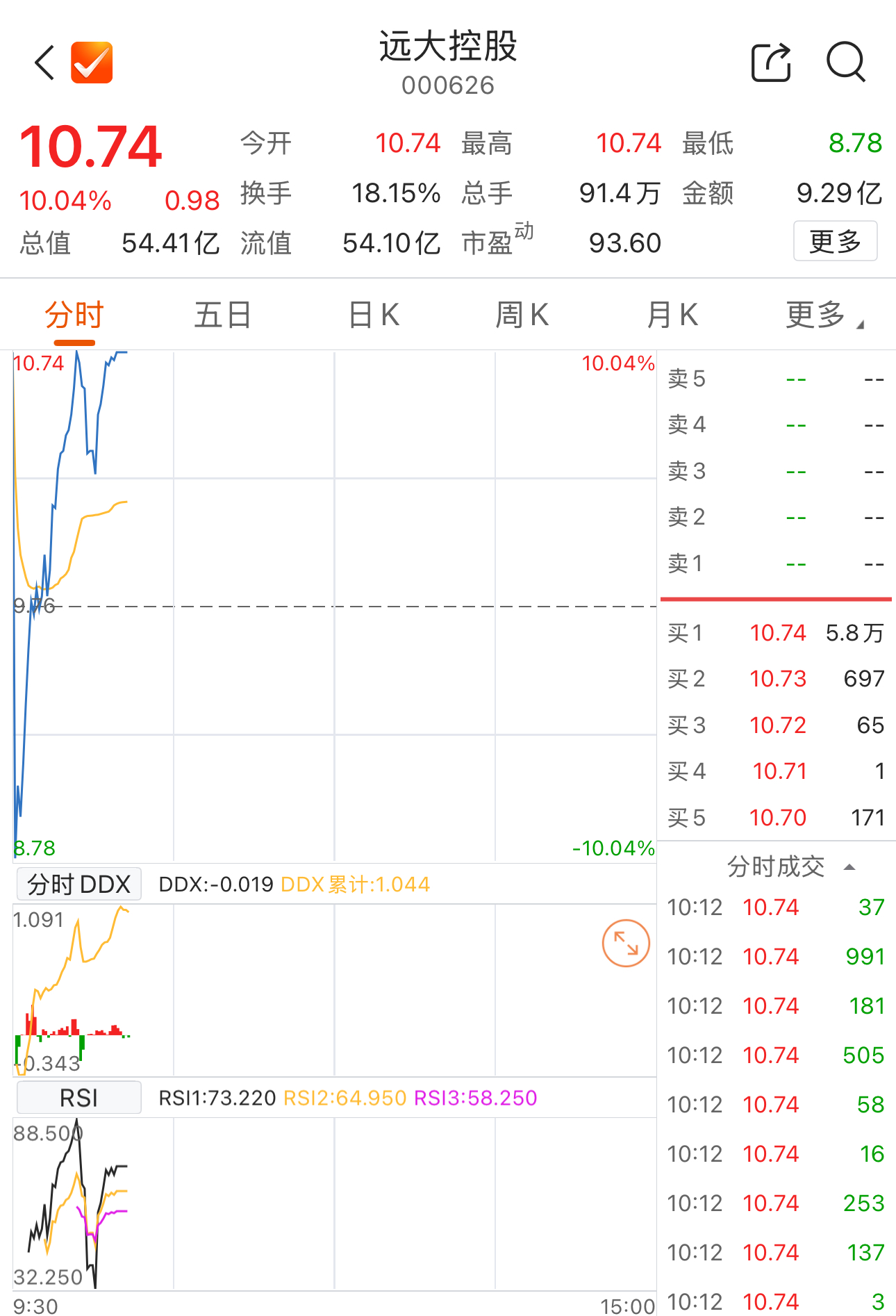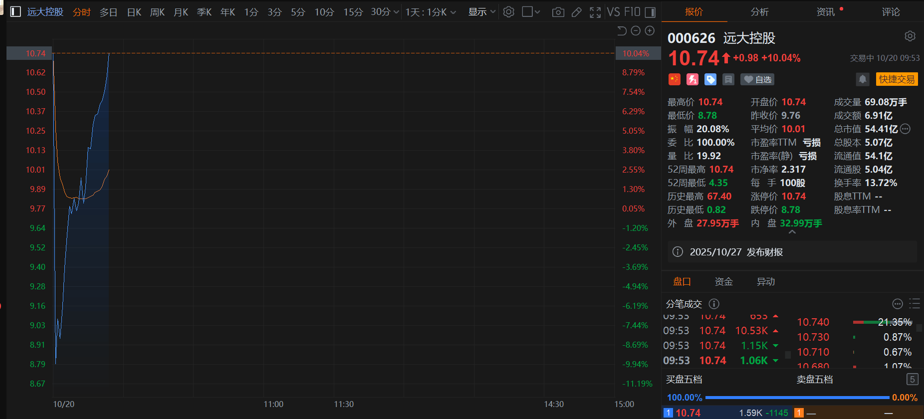 远大控股盘中大幅波动,上演“天地天板”,现报10.74元,成交额6.15亿元