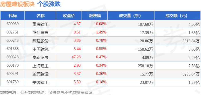 板块整体表现 - 房屋建设板块在11月10日较上一交易日上涨0.8% [1] - 当日上证指数上涨0.53%报收于4018.6点,深证成指上涨0.18%报收于13427.61点 [1] - 板块整体资金呈净流出状态,主力资金净流出1800.01万元,游资资金净流出6576.82万元,散户资金净流入8376.83万元 [1] 领涨个股表现 - 重庆建工领涨板块,收盘价为4.37元,单日涨幅达10.08% [1] - 重庆建工成交量为107.60万手,成交额为4.50亿元 [1] - 该股获得主力资金净流入4595.64万元,主力净占比为10.22% [2] 其他个股涨跌情况 - 浙江建投上涨1.49%报收于9.51元,成交额为1.65亿元 [1] - 陕建股份上涨0.78%报收于3.86元,成交额为8019.84万元 [1] - 中国建筑上涨0.55%报收于5.44元,成交额为8.60亿元 [1] - 高新发展上涨0.47%报收于47.28元,成交额为2.29亿元 [1] - 上海建工上涨0.34%报收于2.93元,成交额为7.56亿元 [1] - 龙元建设上涨0.30%报收于3.37元,成交额为5296.84万元 [1] - 宁波建工上涨0.18%报收于5.50元,成交额为1.27亿元 [1] 个股资金流向 - 中国建筑获得主力资金净流入1381.01万元,主力净占比为1.61% [2] - 高新发展主力资金净流出3464.78万元,主力净占比为-15.13% [2] - 上海建工主力资金净流出2120.64万元,主力净占比为-2.81% [2] - 宁波建工主力资金净流出1133.45万元,主力净占比为-8.95% [2] - 浙江建投主力资金净流出552.10万元,主力净占比为-3.35% [2] - 陕建股份主力资金净流出330.47万元,主力净占比为-4.12% [2] - 龙元建设主力资金净流出175.20万元,主力净占比为-3.31% [2]